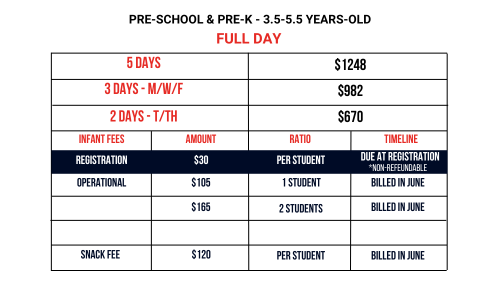 Our registration process includes both paperwork and online components. When you pick up your registration packet, we will give you a brief overview of the contents and the process for completing your registration. In order to finalize your registration, we ask that you submit all completed components along with payment for your first month’s tuition and required registration fees. We will process your registration and schedule a “meet & greet” with your child’s teacher in preparation for enrollment.